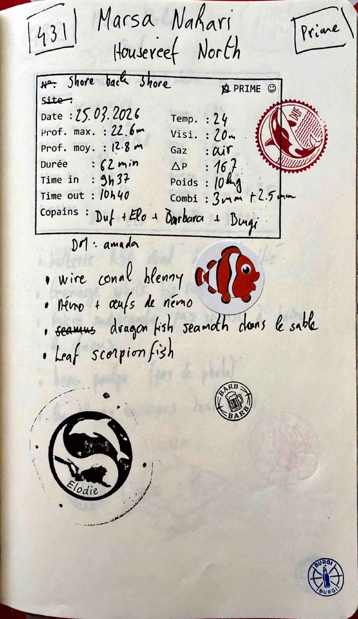Plongée #431 — Housereef North 🔢Marsa Nakari 25 mars 2026🕐 09:37 ⏱ 62 min ↓ 22.6 m 🌡 24°C air 🫧 167 bar ⚖ 10 kg ShoreDuf Elo Barbara Burgi DM AmadaCombi 3mm + 2.5mm. Out 10:40. Prof moy 12.8m. Visi 20m. Shore back shore. Wire coral blenny. Némo + oeufs de némo. Dragon fish seamoth dans le sable. Leaf scorpionfishVie marineClownfish Seamoth Leaf Scorpionfish GobyPage du carnet
