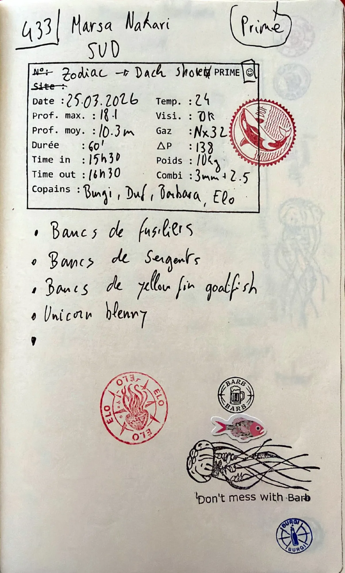 Plongée #433 — Housereef South 🔢Marsa Nakari 25 mars 2026Banc de fusiliers et une carangue — 25 mars 2026 ↓ 13mDes sergent-majors — 25 mars 2026 ↓ 10mUnicorn Blenny — 25 mars 2026 ↓ 8m🕐 15:30 ⏱ 60 min ↓ 18.1 m 🌡 24°C nx32 🫧 138 bar ⚖ 10 kg BoatBurgi Duf Barbara EloCombi 3mm + 2.5mm. Out 16:30. Prof moy 10.3m. Visi ok. Zodiac, back shore. Bancs de fusiliers. Bancs de sergents. Bancs de yellowfin goatfish. Unicorn blennyVie marineFusilier Sergeant Major Yellowfin Goatfish Unicorn BlennyPage du carnet