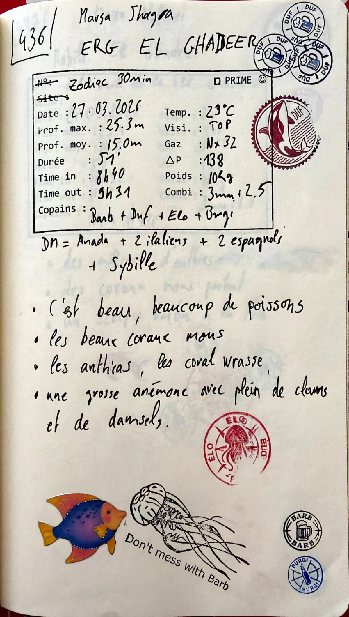 Combi 3mm + 2.5mm. Out 09:31. Prof moy 15.0m. Visi top. Zodiac 30min. + 2 italiens + 2 espagnols. C'est beau, beaucoup de poissons. Les beaux coraux mous. Les anthias, les coral grouper. Une grosse anémone avec plein de clams et de damsels