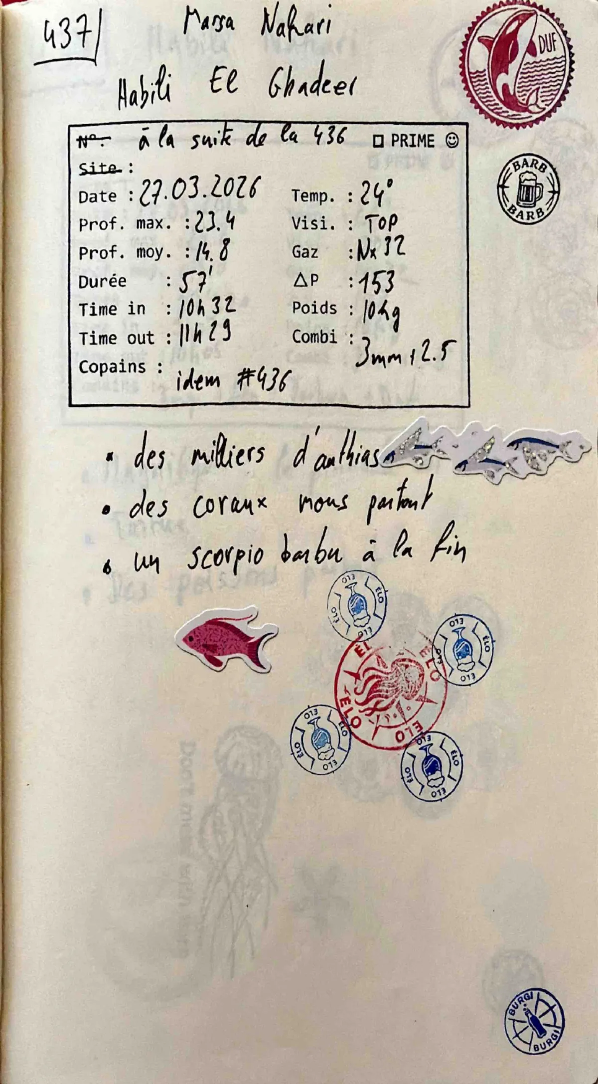Plongée #437 — Habili El GhadeerMarsa Nakari 27 mars 2026Une chiée d'anthias — 27 mars 2026 ↓ 17mUn barbu ! — 27 mars 2026 ↓ 8m🕐 10:32 ⏱ 57 min ↓ 23.9 m 🌡 24°C nx32 🫧 153 bar ⚖ 10 kg BoatBarbara Duf Elo Burgi DM Amada SybilleCombi 3mm + 2.5mm. Out 11:29. Prof moy 14.8m. Visi top. A la suite de la #436. Des milliers d'anthias. Des coraux mous partout. Un scorpio barbu à la finVie marineAnthias Bearded ScorpionfishPage du carnet