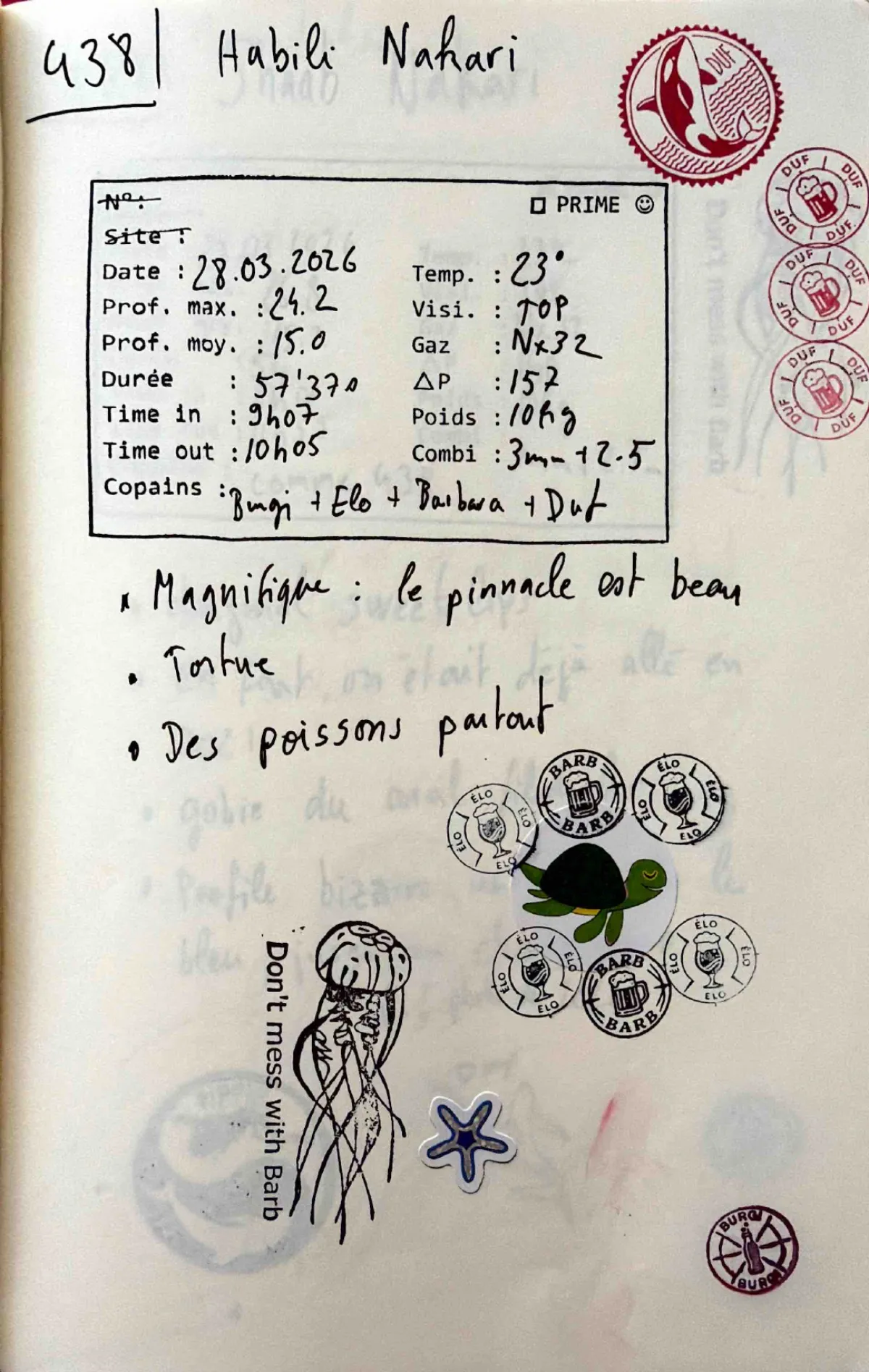 Plongée #438 — Habili NakariMarsa Nakari 28 mars 2026Des anthias — 28 mars 2026 ↓ 5m🕐 09:07 ⏱ 58 min ↓ 24.2 m 🌡 23°C nx32 🫧 157 bar ⚖ 10 kg BoatBurgi Elo Barbara DufCombi 3mm + 2.5mm. Out 10:05. Prof moy 15.0m. Visi top. Magnifique : le pinnacle est beau. Tortue. Des poissons partoutVie marineSea TurtlePage du carnet