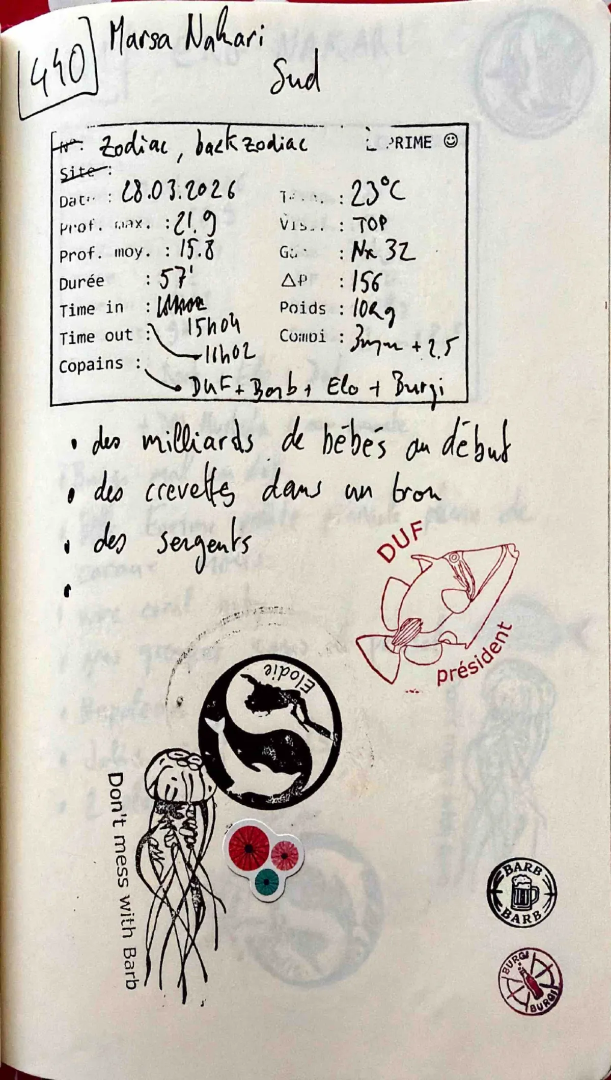 Plongée #440 — Housereef SouthMarsa Nakari 28 mars 2026Crevette dans un trou — 28 mars 2026 ↓ 21mMini clown dans une anémone à bulbe — 28 mars 2026 ↓ 19m🕐 15:04 ⏱ 57 min ↓ 21.9 m 🌡 23°C nx32 🫧 156 bar ⚖ 10 kg BoatDuf Barbara Elo BurgiCombi 3mm + 2.5mm. Out 16:02. Prof moy 15.8m. Visi top. Zodiac, back zodiac. Des milliards de bébés au début. Des crevettes dans un trou. Des sergentsVie marineSergeant MajorPage du carnet