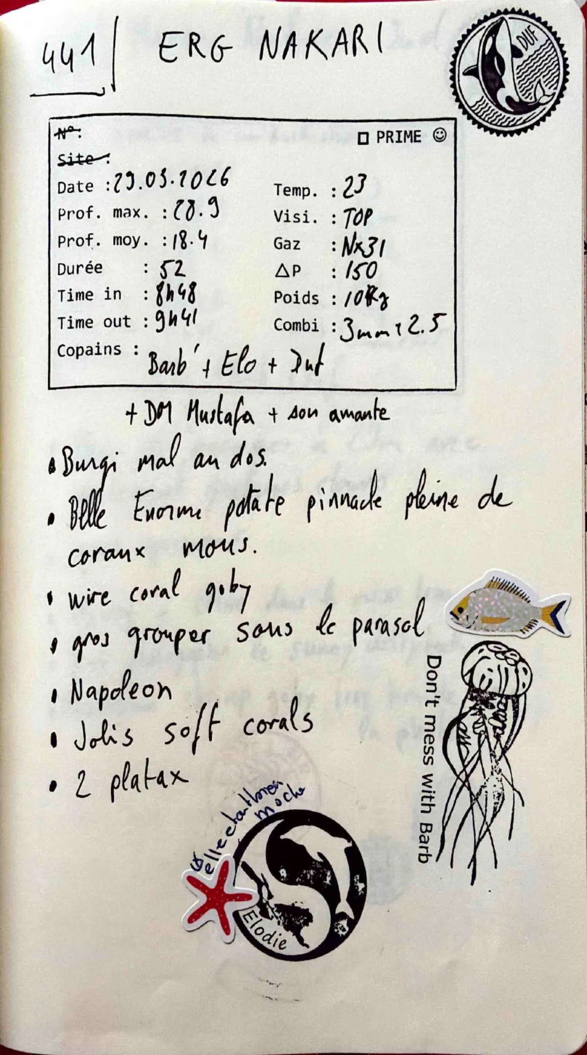 Combi 3mm + 2.5mm. Out 09:41. Prof moy 18.4m. Visi top. Burgi mal au dos. DM Mustafa + son amante. Belle énorme patate pinnacle pleine de coraux mous. Wire coral goby. Gros grouper sous le parasol. Napoléon. Jolis soft corals. 2 platax