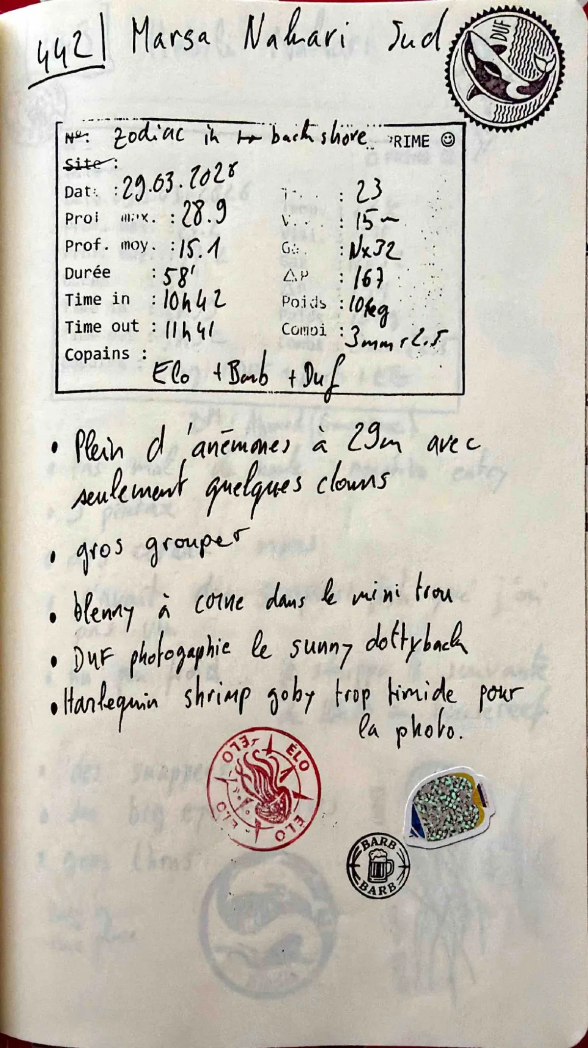 Combi 3mm + 2.5mm. Out 11:41. Prof moy 15.1m. Visi 15m. Zodiac in, back shore. Plein d'anémones à 29m avec seulement quelques clowns. Gros grouper. Blenny à corne dans le mini trou. Duf photographie le sunny dottyback. Harlequin shrimp goby trop timide pour la photo