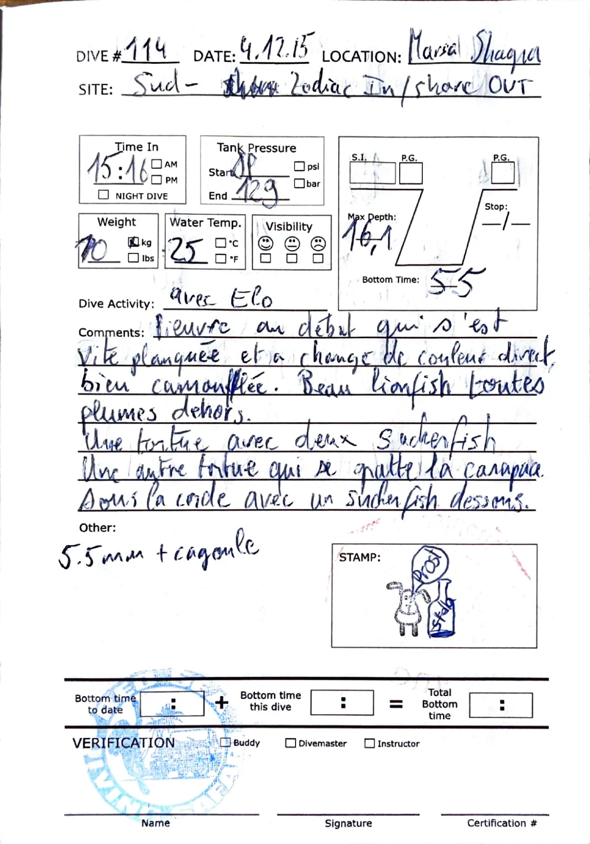 Pieuvre au debut qui s'est vite planquee et a change de couleur direct, bien camouflee. Beau lion fish toutes plumes dehors. Une tortue avec deux sucker fish. Une autre tortue qui se gratte la carapace. Sous la corde avec un sucker fish dessous. 5.5mm + cagoule