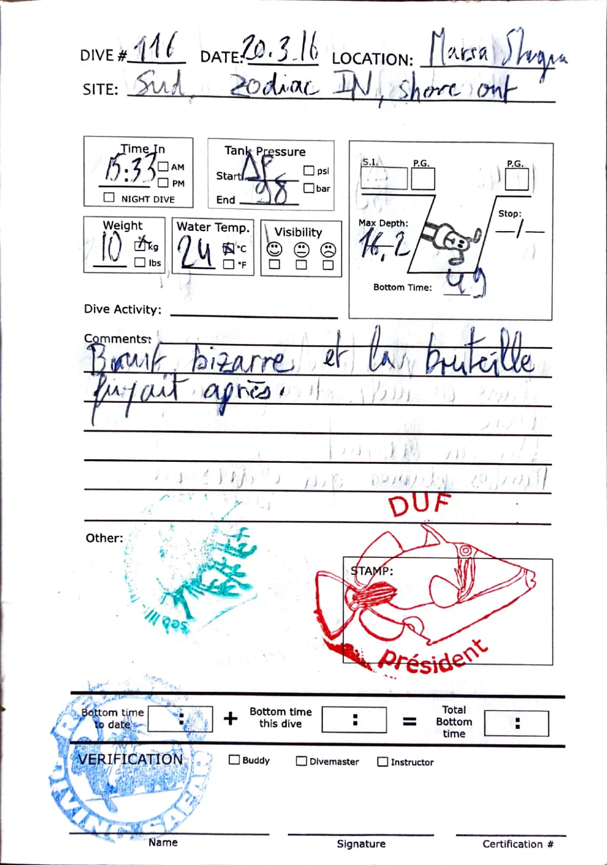 Plongée #116 — Marsa Shagra SudMarsa Shagra 20 mars 2016🕐 15:33 ⏱ 40 min ↓ 16.2 m 🌡 24°C ⚖ 10 kg bateauAvec DufBruit bizarre et la bouteille fuyait apresPage du carnet