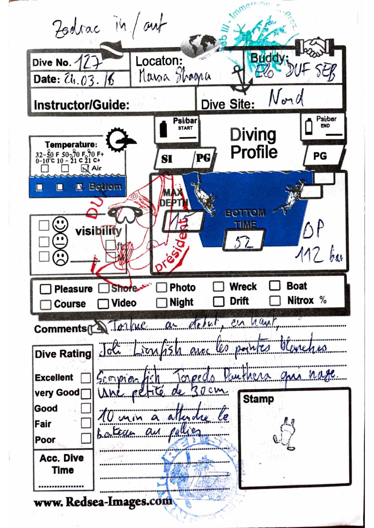 Plongée #127 — Marsa Shagra NordMarsa Shagra 26 mars 2016⏱ 52 min ↓ 15 m 🫧 112 bar bateauAvec Elo + Duf + SebTortue au debut en haut. Joli lionfish avec les pointes blanches. Scorpion fish, torpedo panthera qui nage, une petite de 30cm. 10 min a attendre le bateau au palierPage du carnet