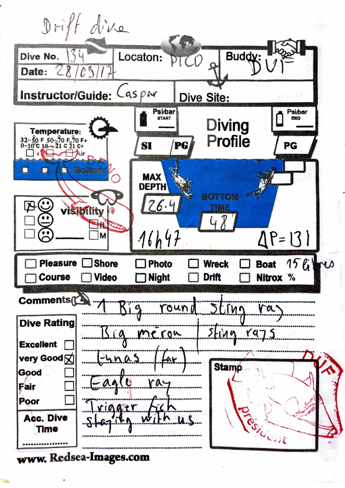 Plongée #134 — PicoAçores 28 septembre 2017🕐 16:47 ⏱ 48 min ↓ 26.4 m 🫧 131 bar bateauAvec DufGuide Caspar. Drift dive. 15 litres. 1 big round sting ray, big merou, sting rays, tunas au loin, eagle ray, trigger fish staying with usPage du carnet
