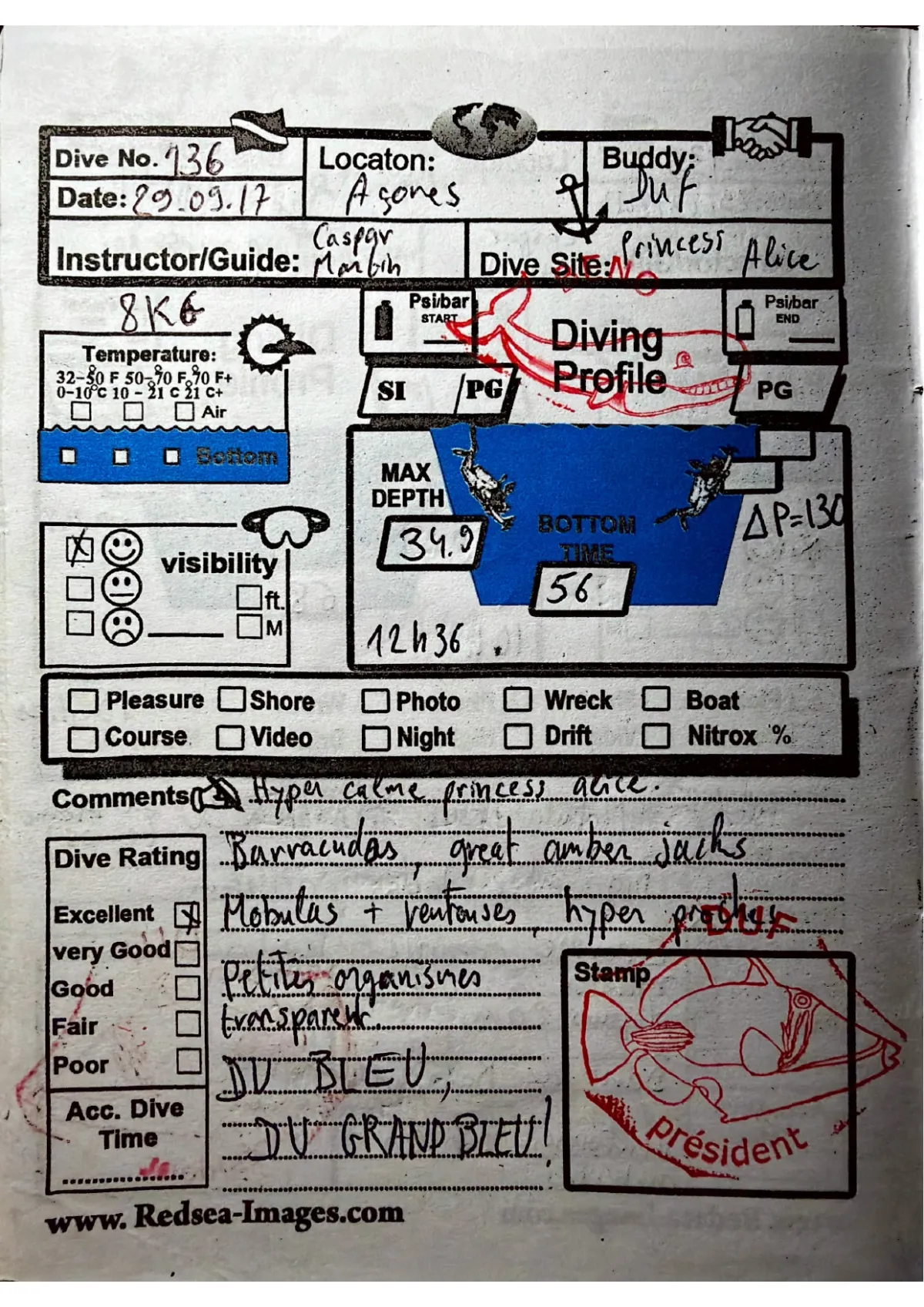 Plongée #136 — Princess AliceAçores 29 septembre 2017🕐 12:36 ⏱ 56 min ↓ 34.9 m 🫧 130 bar ⚖ 8 kg bateauAvec DufGuides Caspar + Martin. Hyper calme. Barracudas, great amber jacks. Mobulas + ventouses hyper proches. Petits organismes transparents. DU BLEU, DU GRAND BLEU!Page du carnet