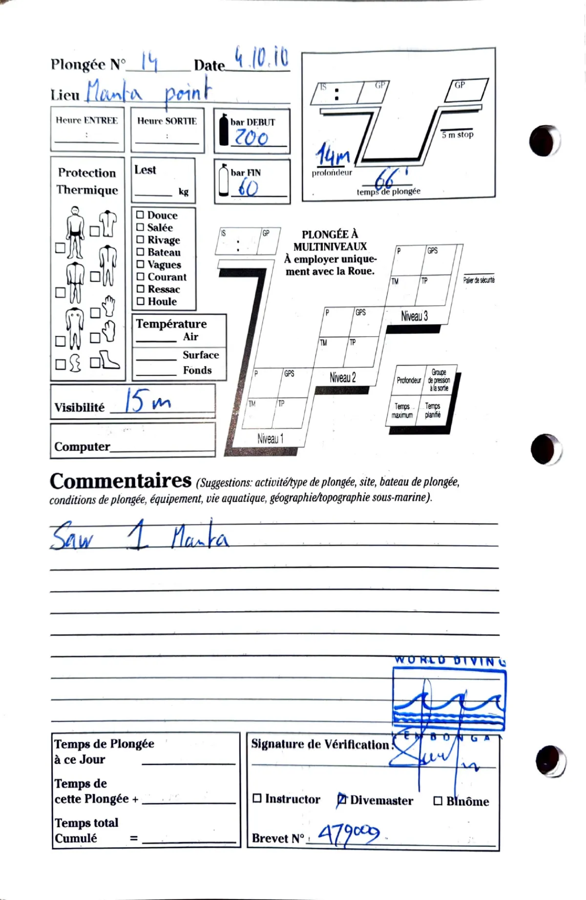 Plongée #14 — Manta PointLembongan 4 octobre 2010⏱ 66 min ↓ 14 m 🫧 140 bar bateauSaw 1 mantaPage du carnet