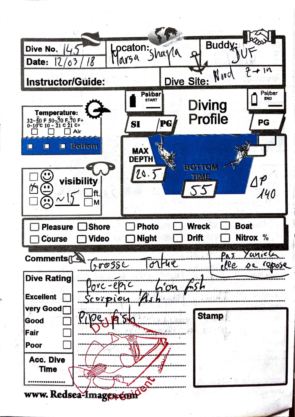 Plongée #145 — Marsa Shagra NordMarsa Shagra 12 mars 2018⏱ 55 min ↓ 20.5 m 🫧 140 bar bateauAvec DufPas Yanick elle se repose. Grosse tortue, porc-epic, lion fish, scorpion fish, pipe fishPage du carnet