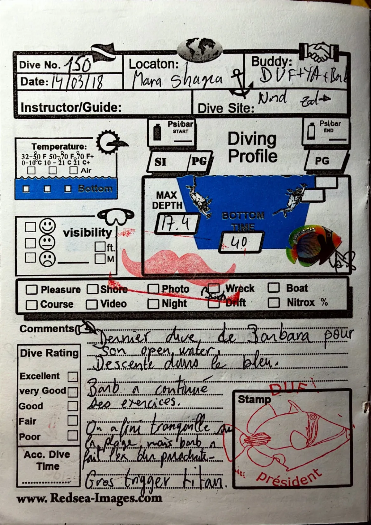 Plongée #150 — Marsa Shagra NordMarsa Shagra 14 mars 2018⏱ 40 min ↓ 17.4 m bateauAvec Duf + Yanick + BarbaraDernier dive de Barbara pour son open water. Descente dans le bleu. Barbara a continue ses exercices. Gros trigger titanPage du carnet