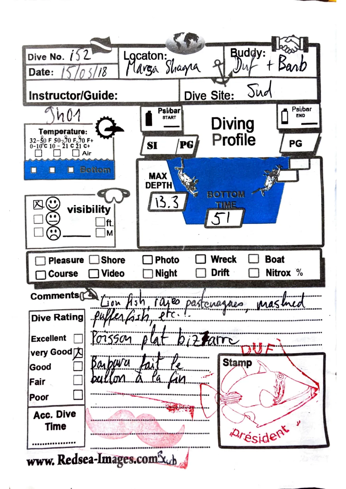 Plongée #152 — Marsa Shagra SudMarsa Shagra 15 mars 2018🕐 09:01 ⏱ 51 min ↓ 13.3 m bateauAvec Duf + BarbaraLion fish, raies pastenagues, masked puffer etc. Poisson plat bizarre. Barbara fait le ballon a la finPage du carnet