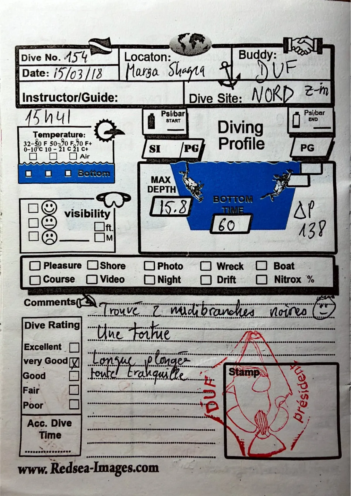 Plongée #154 — Marsa Shagra NordMarsa Shagra 15 mars 2018🕐 15:41 ⏱ 60 min ↓ 15.8 m 🫧 138 bar bateauAvec DufTrouve 2 nudibranches noires. Une tortue. Longue plongee toute tranquillePage du carnet