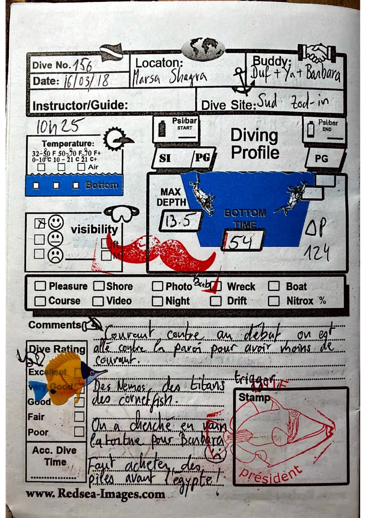Plongée #156 — Marsa Shagra SudMarsa Shagra 16 mars 2018🕐 10:25 ⏱ 54 min ↓ 13.5 m 🫧 124 bar bateauAvec Duf + Yanick + BarbaraCourant contre au debut, alle contre la paroi. Des nemos, des titans triggers, des cornetfish. Cherche en vain la tortue pour BarbaraPage du carnet