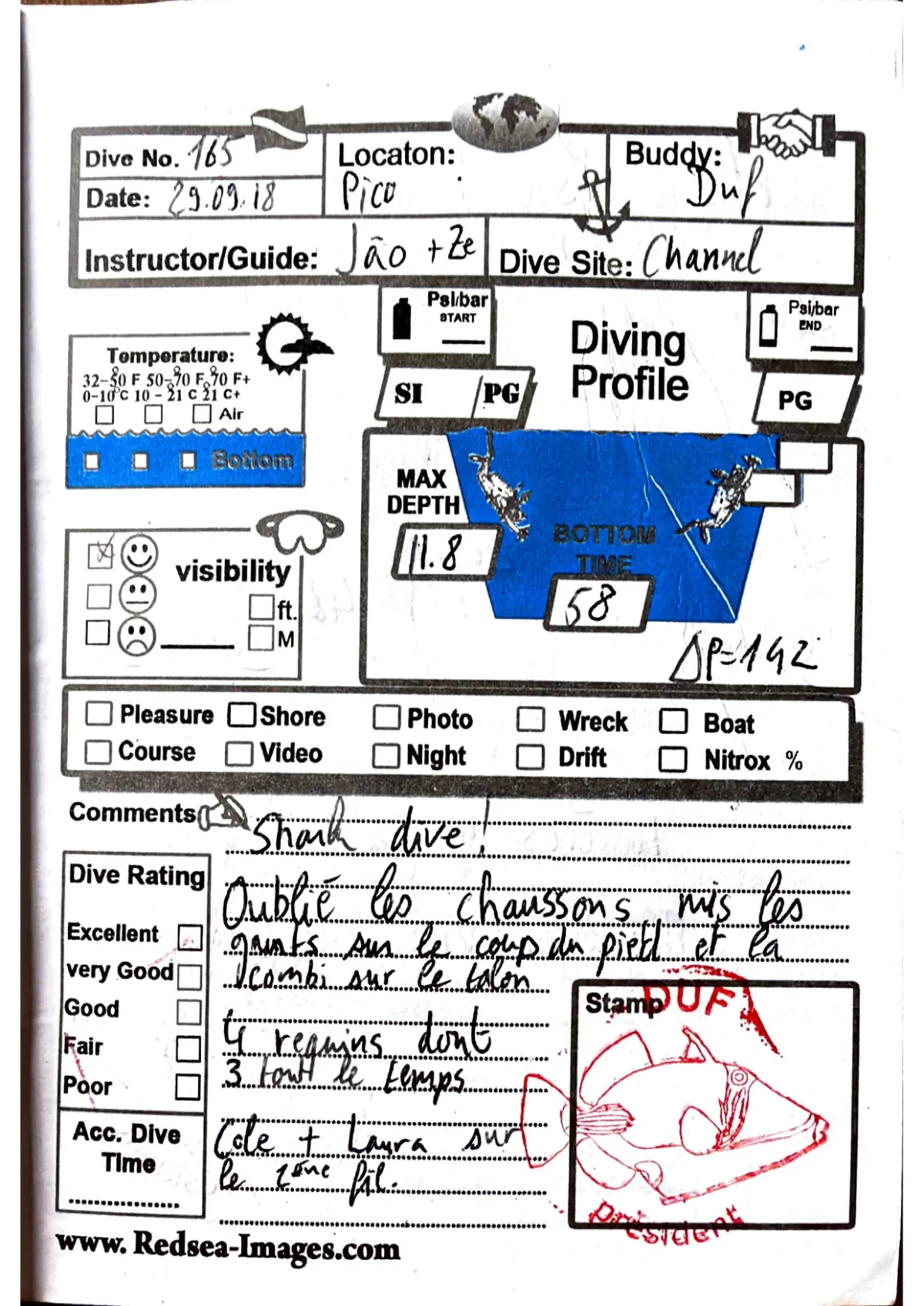 Plongée #165 — ChannelAçores 29 septembre 2018⏱ 58 min ↓ 11.8 m 🫧 142 bar bateauAvec DufGuides Jao + Ze. Shark dive! Oublie les chaussons. 4 requins dont 3 tout le temps. Cole + Laura sur le zinc filPage du carnet