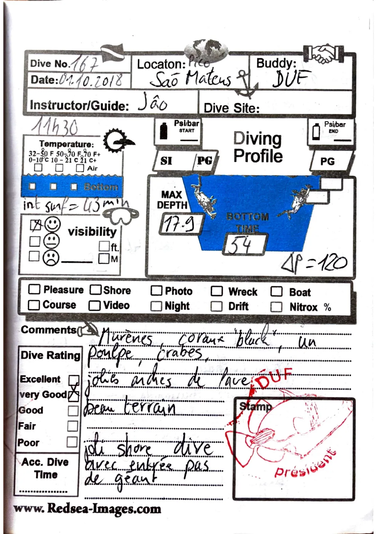 Plongée #167 — Sao MateusAçores 1 octobre 2018🕐 11:30 ⏱ 54 min ↓ 17.9 m 🫧 120 bar rivageAvec DufGuide Jao. Murenes, coraux, poulpe, crabes. Jolies arches de lave. Beau terrain. Joli shore dive avec entree pas de geantPage du carnet
