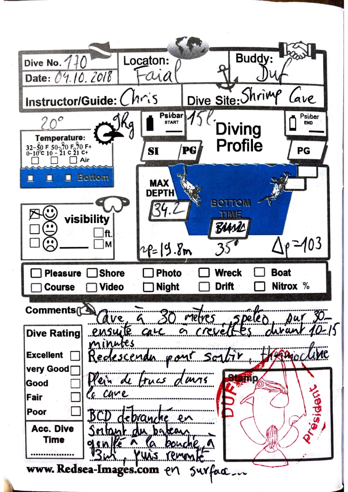 Plongée #170 — Shrimp CaveAçores 4 octobre 2018⏱ 35 min ↓ 34.2 m 🌡 20°C 🫧 103 bar ⚖ 9 kg bateauAvec DufGuide Chris. Faial. 15 litres. Cave a 30m, speleo sur 80m. Cave a crevettes 10-15 min. Thermocline. BCD debranche en sortant du bateau, gonfle a la bouche a 13m puis remonte en surfacePage du carnet