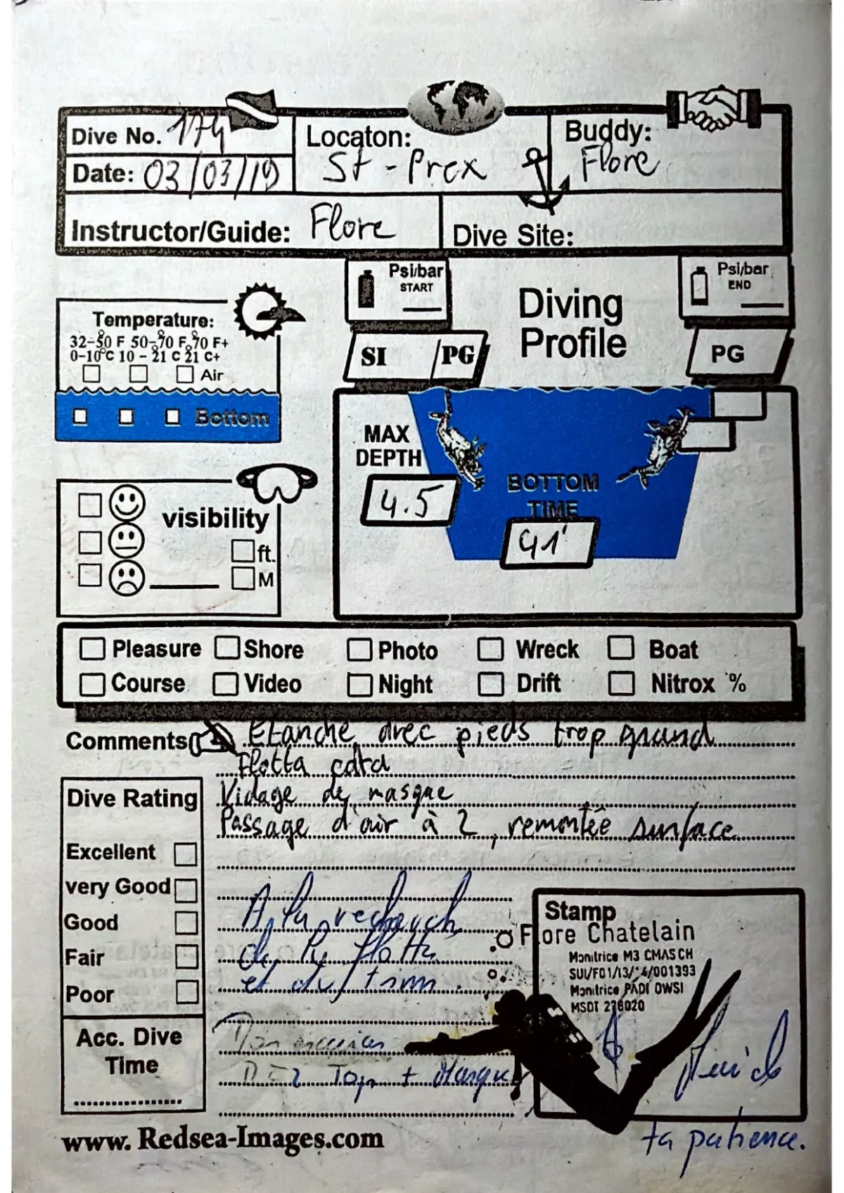 Plongée #174 — St-PrexLac Léman 3 mars 2019⏱ 41 min ↓ 4.5 m rivageAvec FloreEtanche avec pieds trop grands. Flotta cadra. Vidage de masque. Passage d'air a 2, remontee surfacePage du carnet