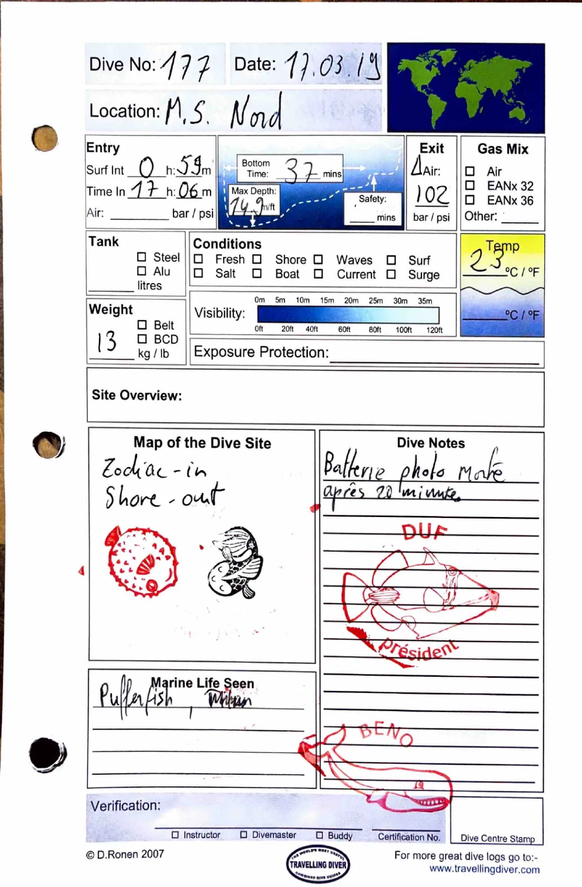 Plongée #177 — Housereef NorthMarsa Shagra 17 mars 2019🕐 17:06 ⏱ 37 min ↓ 14.9 m 🌡 23°C 🫧 102 bar ⚖ 13 kg Zodiac in / shore outBatterie photo morte après 22 minutes. Pufferfish, mérouPage du carnet