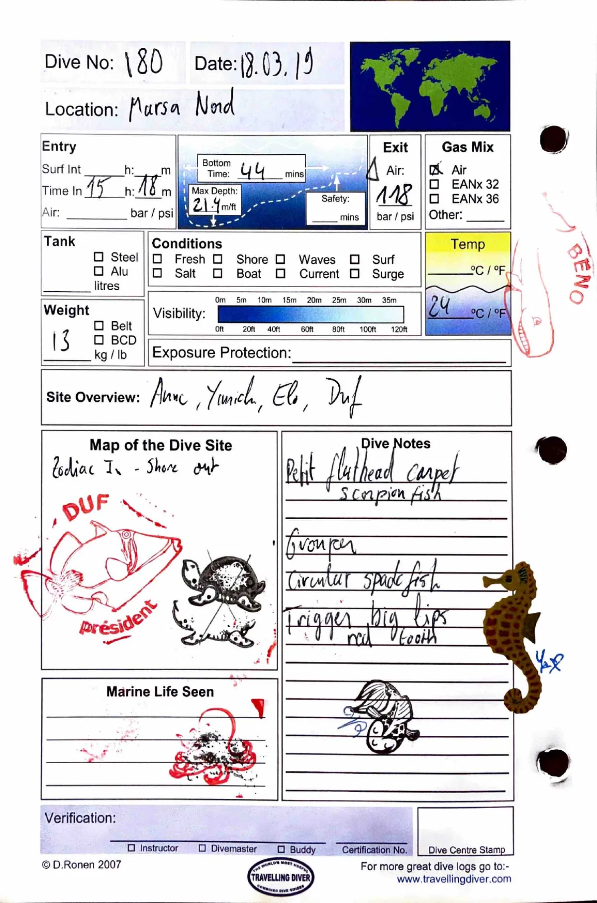 Plongée #180 — Housereef NorthMarsa Shagra 18 mars 2019🕐 15:18 ⏱ 44 min ↓ 21 m 🌡 24°C 🫧 118 bar ⚖ 13 kg Zodiac in / shore outAvec Anne + Yanick + Elo + DufRight flathead carpet scorpion fish. Cronies. Circular spadefish. Trigger big lips red teethPage du carnet
