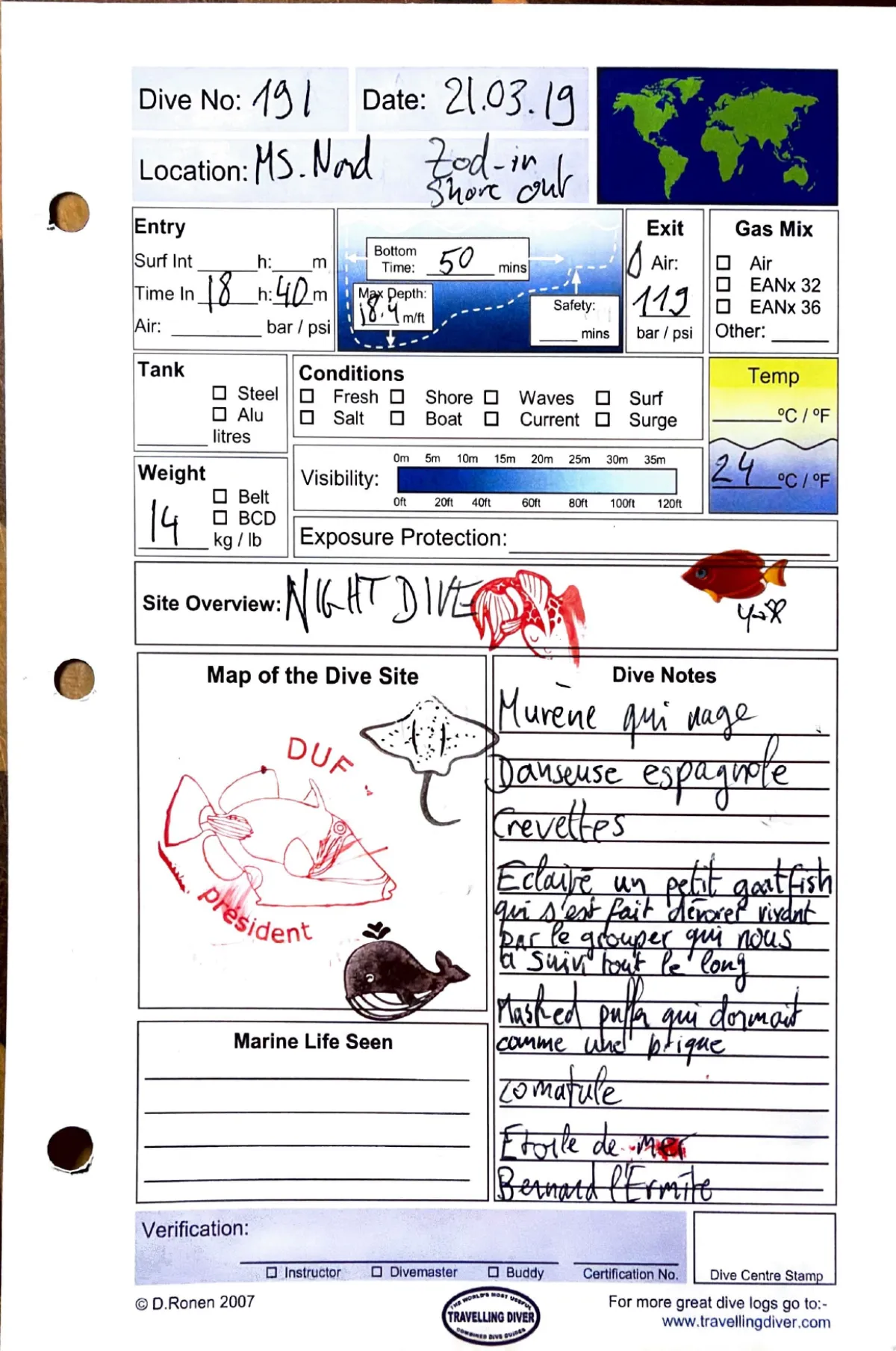 NIGHT DIVE. Murène qui nage. Danseuse espagnole. Crevettes. Éclairé un petit goatfish qui s'est fait choper/violer par le grouper qui nous a suivi tout le long. Masked puffer qui dormait comme une bûche. Zoanthule. Étoile de mer. Bernard l'ermite