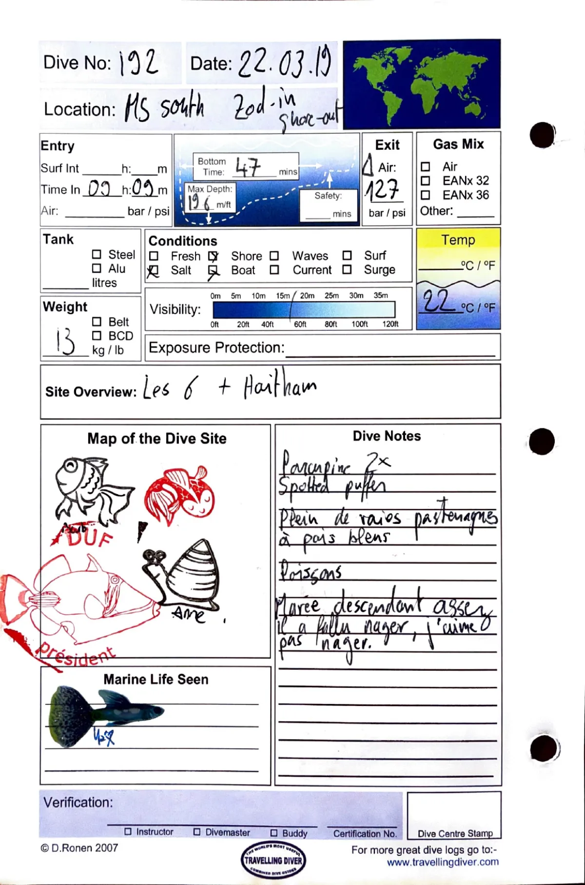 Plongée #192 — Housereef SouthMarsa Shagra 22 mars 2019🕐 09:09 ⏱ 47 min ↓ 19 m 🌡 22°C 🫧 123 bar ⚖ 13 kg Zodiac in / shore outAvec Les 6 + HaithamPorcupine fix. Spotted puffer. Plein de raies pastenagues à pois bleus. Boissons. Marée descendant assez, il a fallu nager, l'autre pas nagerPage du carnet