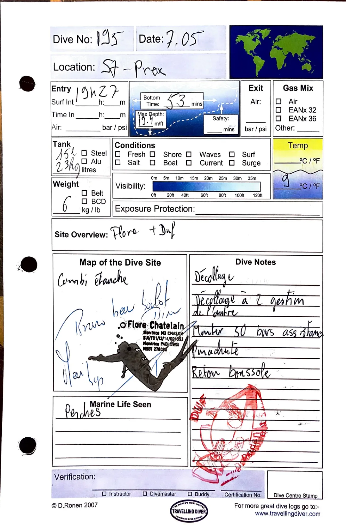 Plongée #195 — St-PrexSt-Prex 7 mai 2019🕐 19:27 ⏱ 53 min ↓ 19.4 m 🌡 9°C ⚖ 6 kgAvec Flore + DufFormation CMAS 2 etoiles / pont PADI Rescue. Combi etanche. Decollage. Parachute. Retour boussolePage du carnet