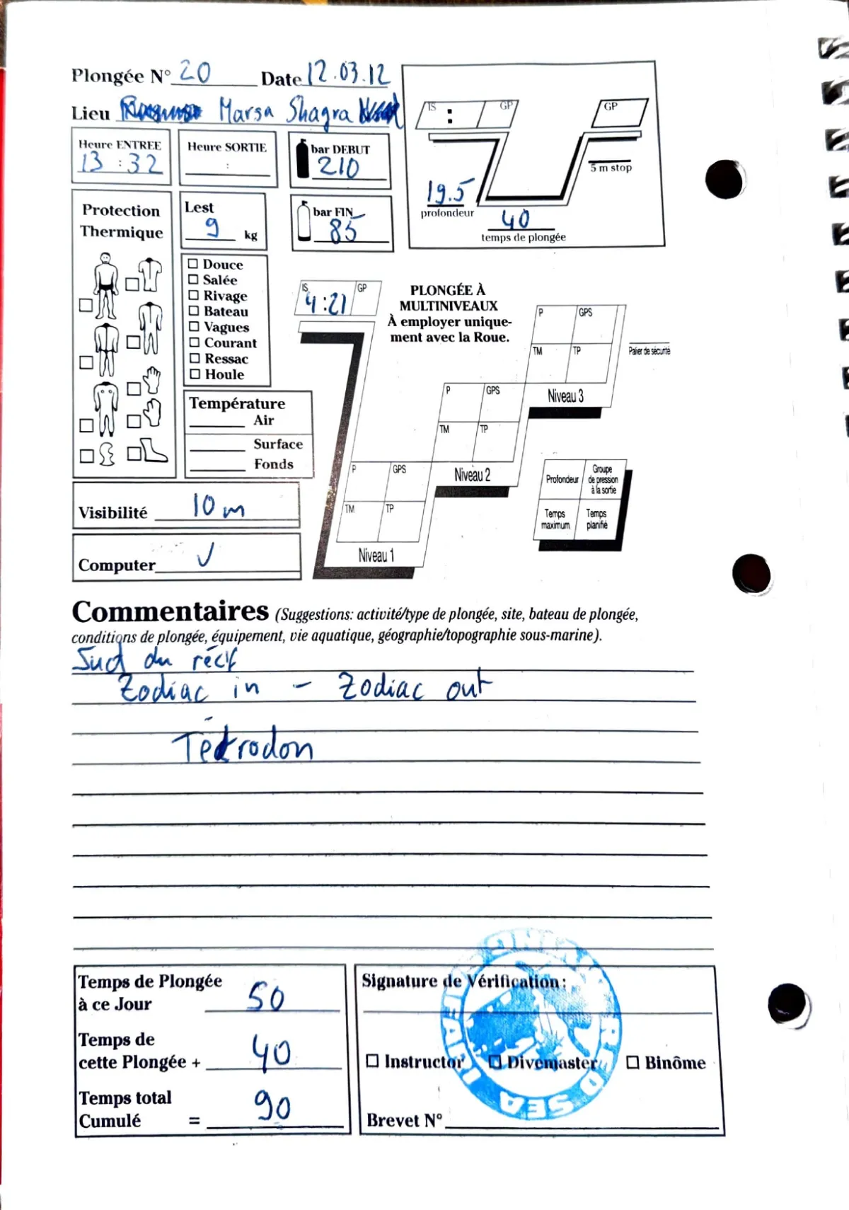 Plongée #20 — Marsa ShagraMarsa Shagra 12 mars 2012🕐 13:32 ⏱ 40 min ↓ 19.5 m 🫧 125 bar ⚖ 9 kg bateauSud du recif. Zodiac in, zodiac out. TetrodonPage du carnet