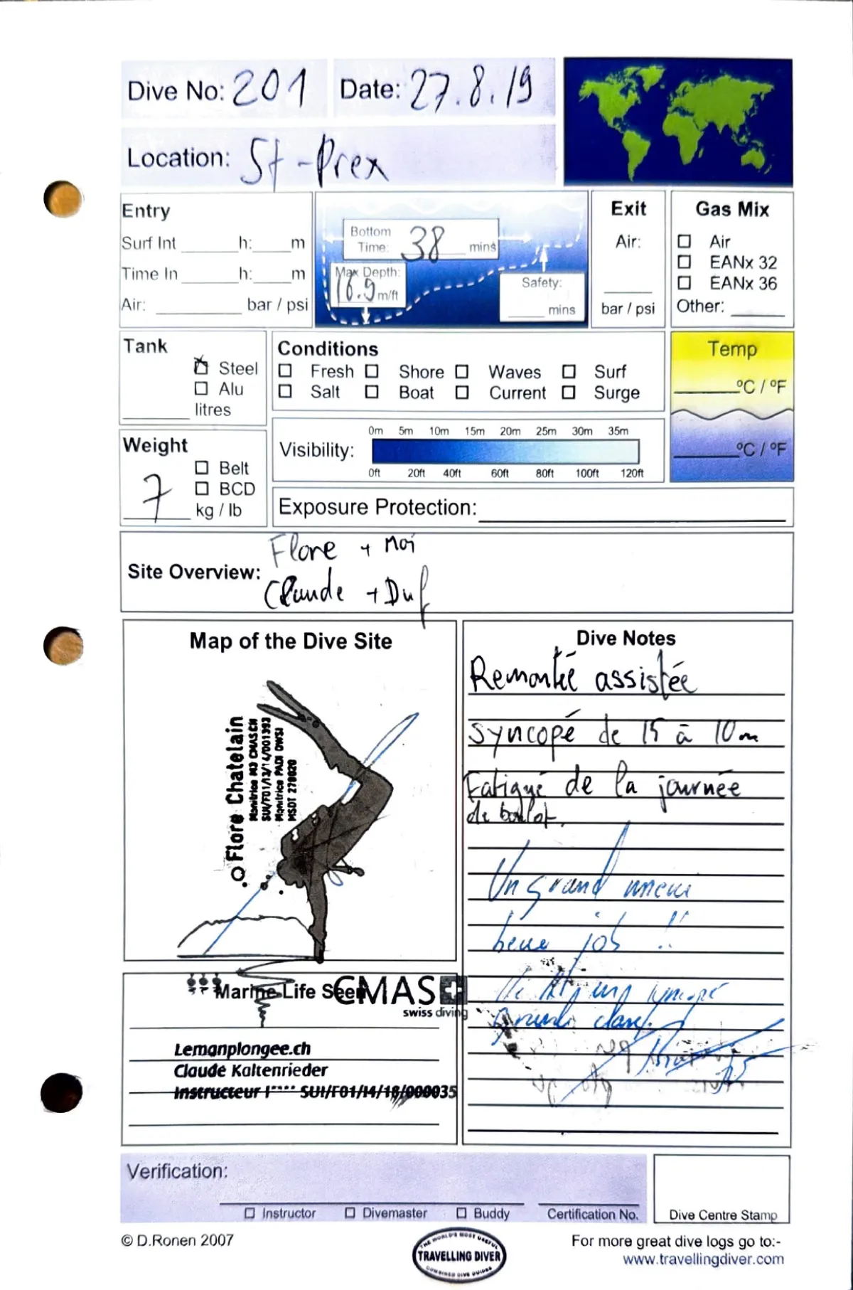 Plongée #201 — St-PrexSt-Prex 27 août 2019⏱ 38 min ↓ 18 m ⚖ 7 kgAvec Flore + Claude + DufFormation CMAS 2 etoiles / pont PADI Rescue. Remontee assistee. Syncope de 15 a 10mPage du carnet
