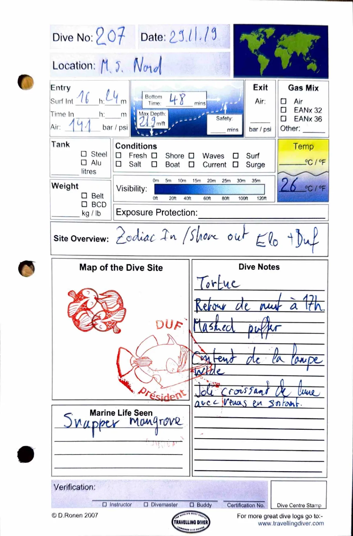 Plongée #207 — Housereef NorthMarsa Shagra 29 novembre 2019🕐 16:24 ⏱ 48 min ↓ 21 m 🌡 26°C 🫧 191 bar Zodiac in / shore outAvec Elo + DufTortue. Retour de nuit à 17h. Masked puffer. Content de la loupe tortue. Joli croissant de lune avec Vénus en sortant. Marine life: Snapper, MangrovePage du carnet