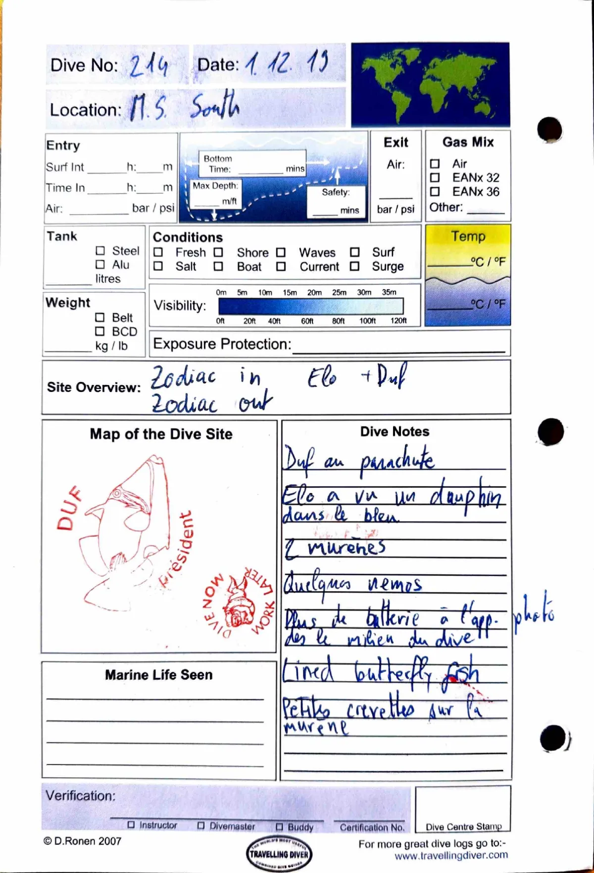 Plongée #214 — Housereef SouthMarsa Shagra 1 décembre 2019Zodiac in / zodiac outAvec Elo + DufDuf en parachute. Elo a vu un dauphin dans le bleu. 2 murènes. Quelques nemos. Plus de batterie à l'app. photo en fin de dive! Lined butterflyfish. Petites crevettes sur la murènePage du carnet