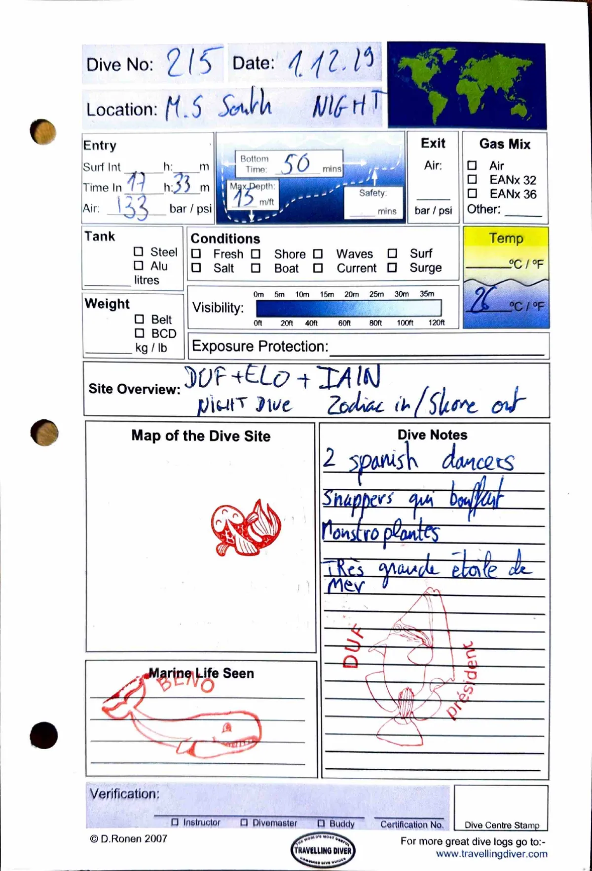 Plongée #215 — Housereef SouthMarsa Shagra 1 décembre 2019🕐 17:33 ⏱ 50 min ↓ 15 m 🌡 26°C 🫧 133 bar Night dive. Zodiac in / shore outAvec Duf + Elo + Iain2 spanish dancers. Snappers qui bouffent. Monstro plantes. Très grande étoile de merPage du carnet
