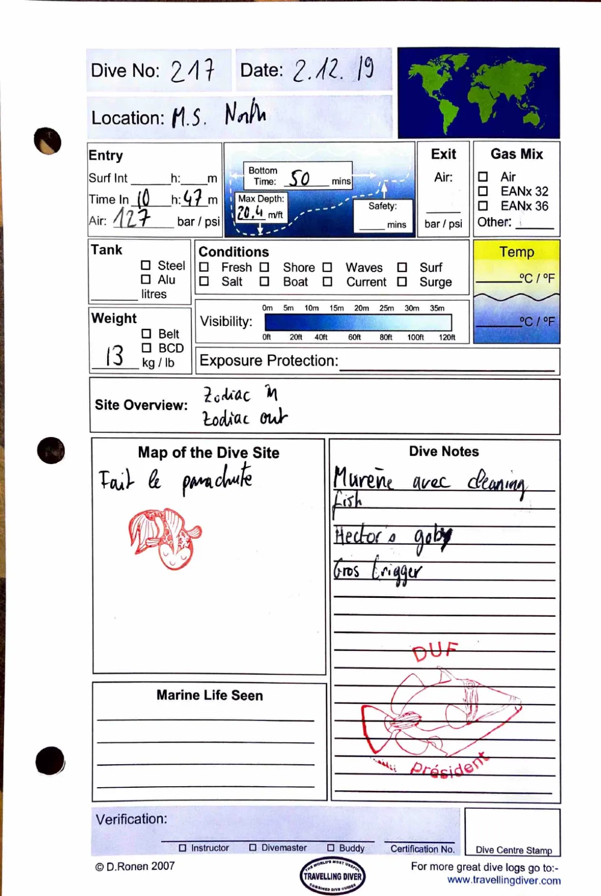 Plongée #217 — Housereef NorthMarsa Shagra 2 décembre 2019🕐 10:47 ⏱ 50 min ↓ 29 m 🫧 127 bar ⚖ 13 kg Zodiac in / zodiac outFait le parachute. Murène avec cleaning fish. Hector's goby. Gros triggerPage du carnet
