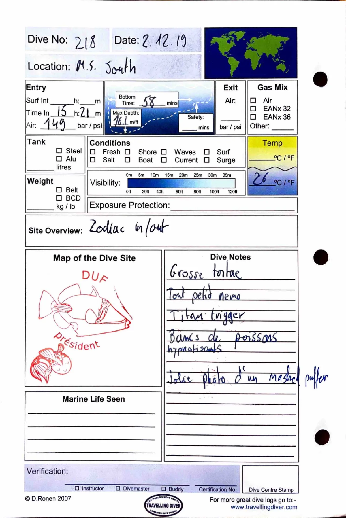Plongée #218 — Housereef SouthMarsa Shagra 2 décembre 2019🕐 15:21 ⏱ 58 min ↓ 16.1 m 🌡 26°C 🫧 149 bar Zodiac in/outGrosse tortue. Fort petit nemo. Titan trigger. Bancs de poissons hypnotisants. Jolie photo d'un masked pufferPage du carnet