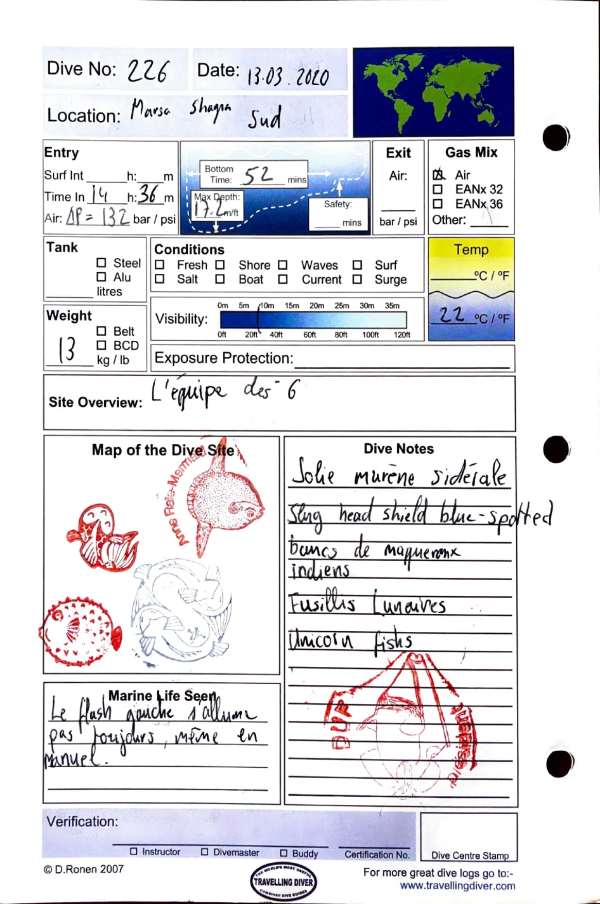 Plongée #226 — Housereef SouthMarsa Shagra 13 mars 2020🕐 14:36 ⏱ 52 min ↓ 17.2 m 🌡 22°C ⚖ 13 kgAvec L'équipe des 6Jolie murène sidérale. Stag head shield blue-spotted. Bancs de maquereaux indiens. Fusiliers lunaires. Lincoln fishs. Notes: Le flash gauche s'allume pas toujours, même en manuelPage du carnet