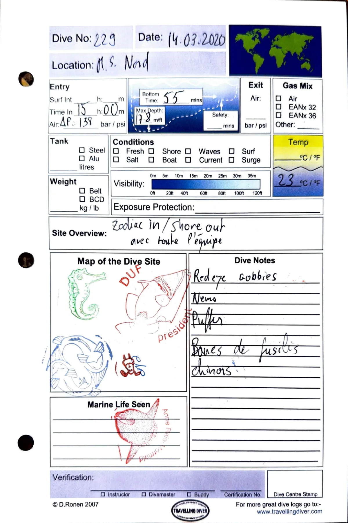 Plongée #229 — Housereef NorthMarsa Shagra 14 mars 2020🕐 15:00 ⏱ 55 min ↓ 12 m 🌡 23°C Zodiac in / shore outAvec Avec toute l'équipeRedeye gobbies. Nemo. Puffer. Bancs de fusiliers chinoisPage du carnet