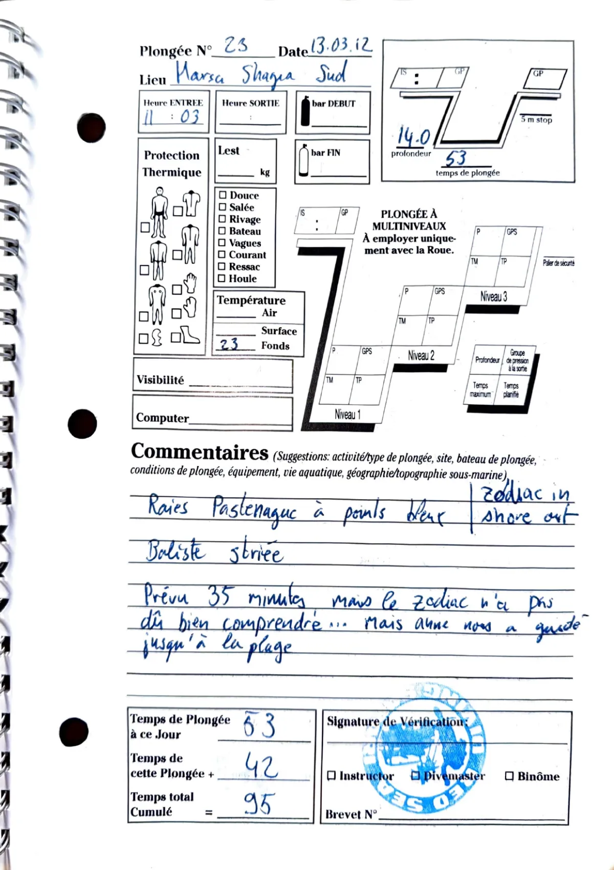 Plongée #23 — Marsa Shagra SudMarsa Shagra 13 mars 2012🕐 11:03 ⏱ 53 min ↓ 14 m 🌡 23°CRaies pastenague a points bleus, baliste striee. Prevu 35 min mais le zodiac n'a pas du bien comprendre. Zodiac in, shore outPage du carnet