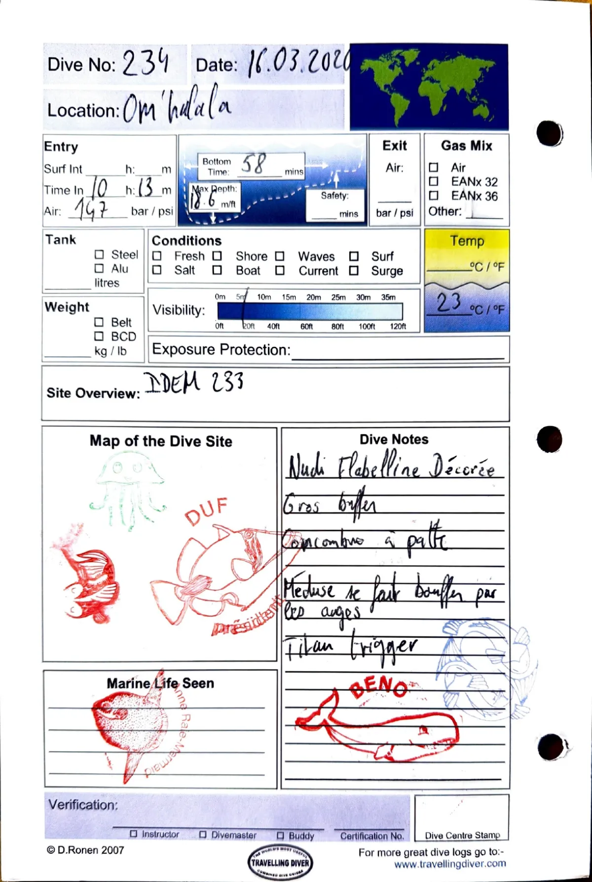 Plongée #234 — Om'halalaMarsa Shagra 16 mars 2020🕐 10:13 ⏱ 58 min ↓ 18.6 m 🌡 23°C 🫧 147 barAvec Idem 233Nudi Flabelline décorée. Gros oyster. Concombre à patte. Méduse se fait bouffer par des anges. Titan triggerPage du carnet