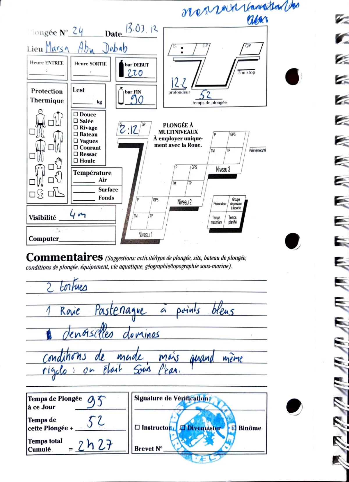 Plongée #24 — Marsa Abu DababMarsa Shagra 13 mars 2012⏱ 52 min ↓ 12.2 m 🫧 130 bar2 tortues, 1 raie pastenague a points bleus, demoiselles dominos. Conditions de merde mais quand meme rigoloPage du carnet