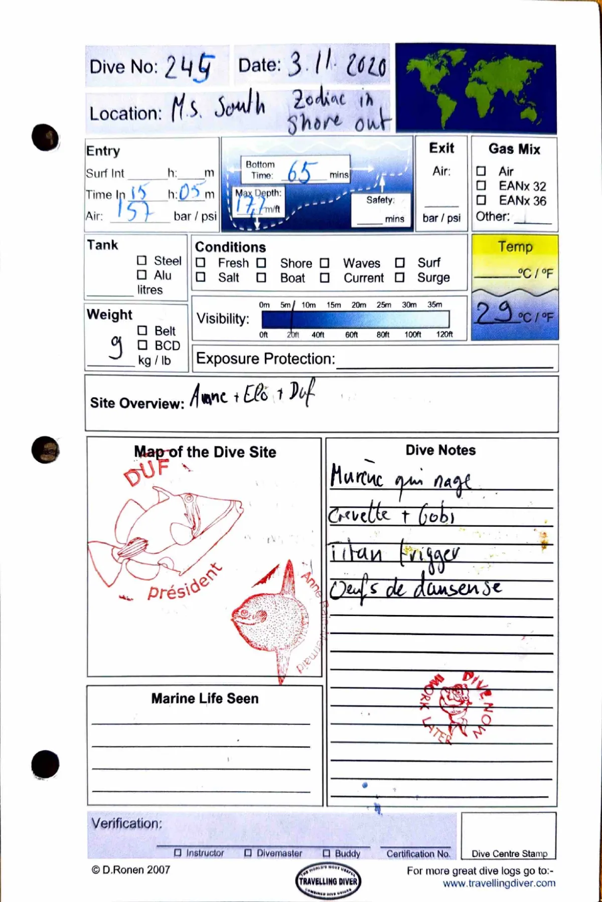 Plongée #245 — Housereef SouthMarsa Shagra 3 novembre 2020🕐 15:05 ⏱ 65 min ↓ 17.7 m 🌡 29°C 🫧 157 bar ⚖ 9 kg Zodiac in / shore outAvec Anne + Elo + DufMurene qui nage. Crevette + Gobi. Titan trigger. Oeufs de danseusePage du carnet