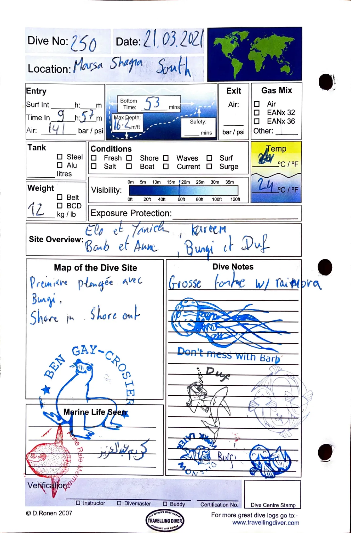 Plongée #250 — Housereef SouthMarsa Shagra 21 mars 2021🕐 09:57 ⏱ 53 min ↓ 16.2 m 🌡 24°C 🫧 141 bar ⚖ 12 kg Shore in / shore outAvec Elo, Yanick, Barb, Anne, Kareem, Bungi, DufPremiere plongee avec Bungi. Grosse tortue w/ raimoraPage du carnet
