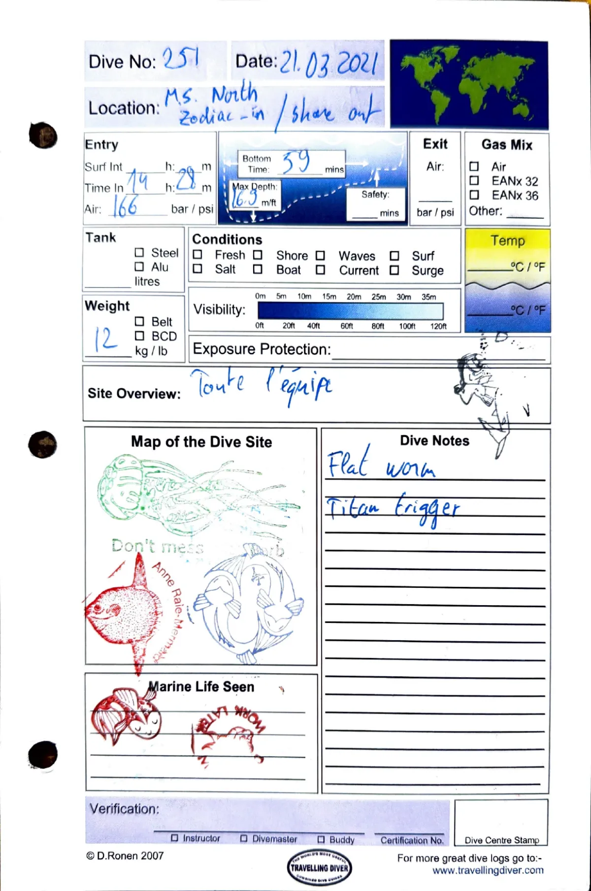 Plongée #251 — Housereef NorthMarsa Shagra 21 mars 2021🕐 14:28 ⏱ 39 min ↓ 16.3 m 🫧 166 bar ⚖ 12 kg Zodiac in / shore outAvec Toute l'equipeFlat worm. Titan triggerPage du carnet