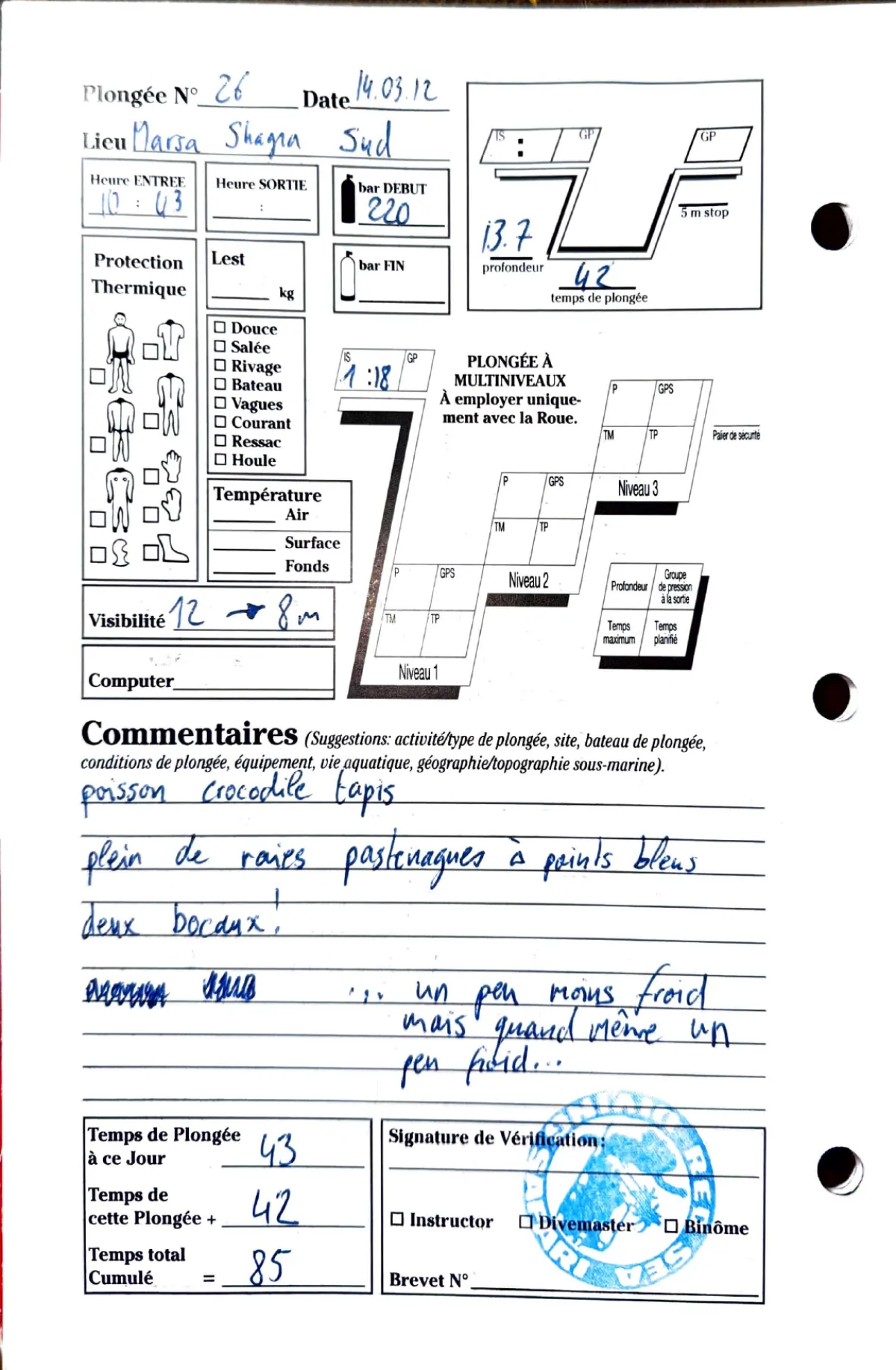 Plongée #26 — Marsa Shagra SudMarsa Shagra 14 mars 2012🕐 10:03 ⏱ 42 min ↓ 13.7 mPoisson crocodile tapis. Plein de raies pastenagues a points bleus, deux bordaux. Un peu moins froid mais quand meme un peu froidPage du carnet