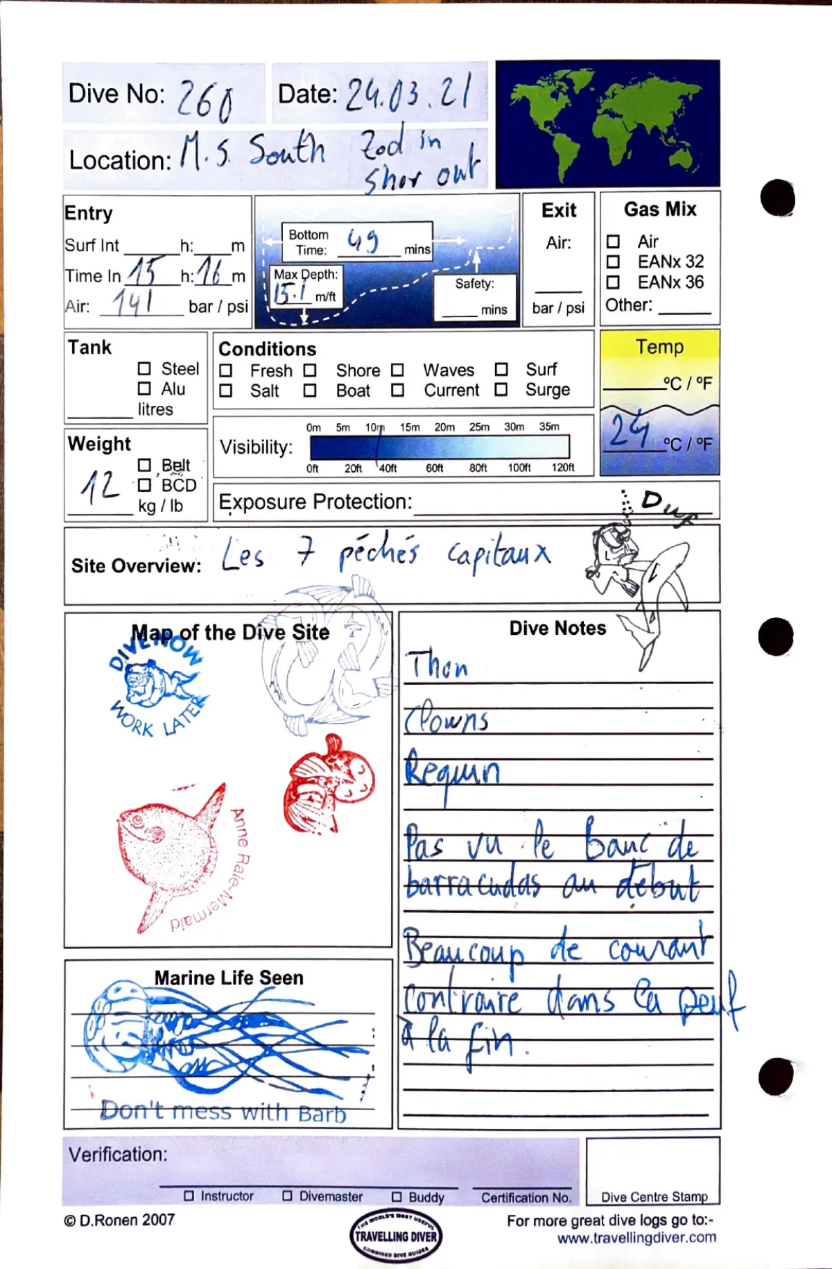Plongée #260 — Housereef SouthMarsa Shagra 24 mars 2021🕐 15:16 ⏱ 49 min ↓ 15.1 m 🌡 24°C 🫧 141 bar ⚖ 12 kg Zodiac in / shore outAvec Les 7 peches capitauxThon. Clowns. Requin. Pas vu le banc de barracudas au debut. Beaucoup de courant contraire dans la deuf a la finPage du carnet