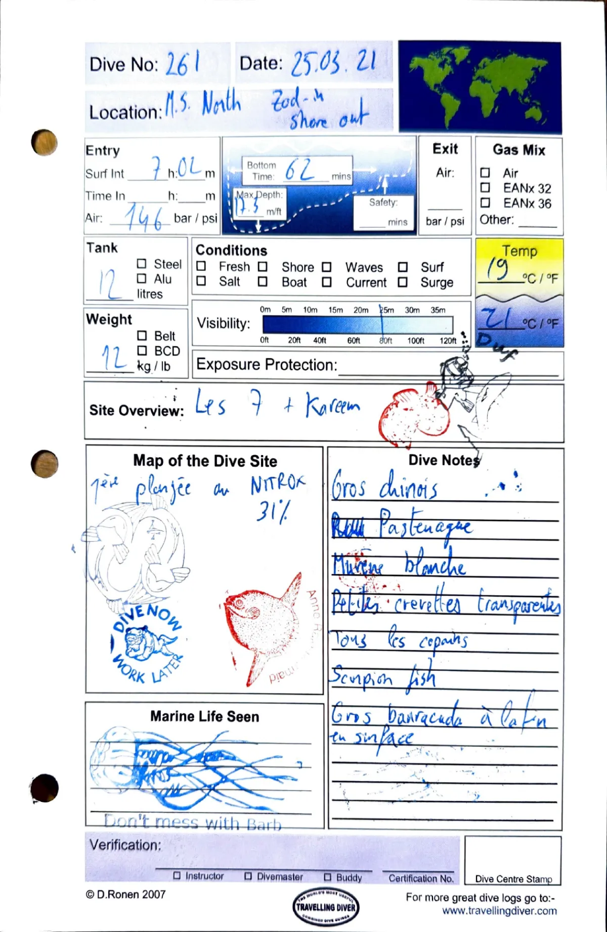 1ere plongee au nitrox 31%. Gros chinois. Raie pastenague. Murene blanche. Petites crevettes transparentes. Tous les copains. Scorpion fish. Gros barracuda a la fin en surface