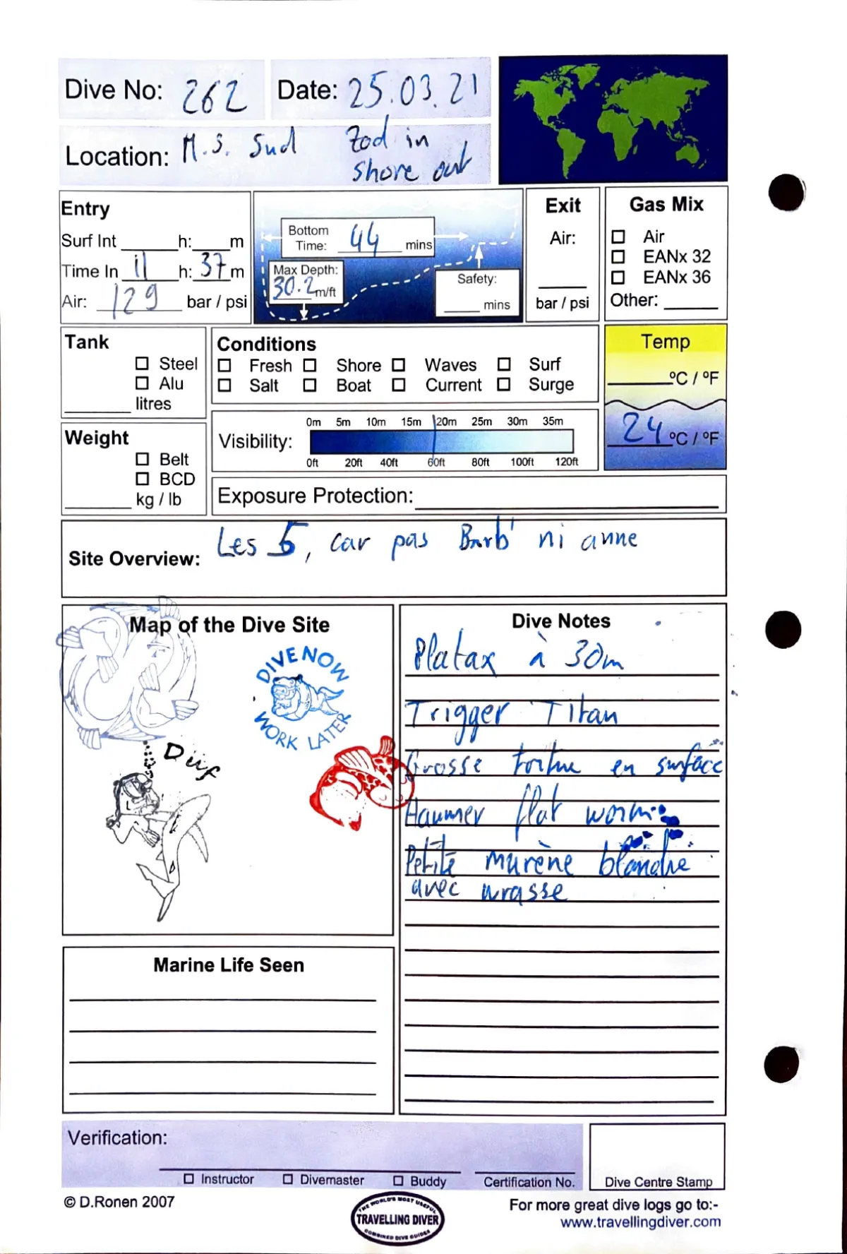 Plongée #262 — Housereef SouthMarsa Shagra 25 mars 2021🕐 11:37 ⏱ 44 min ↓ 30.2 m 🌡 24°C 🫧 129 bar ⚖ 12 kg Zodiac in / shore outAvec Les 5 car pas Barb ni AnnePlatax a 30m. Trigger Titan. Grosse tortue en surface. Haumer flat worm. Petite murene blanche avec labrassePage du carnet