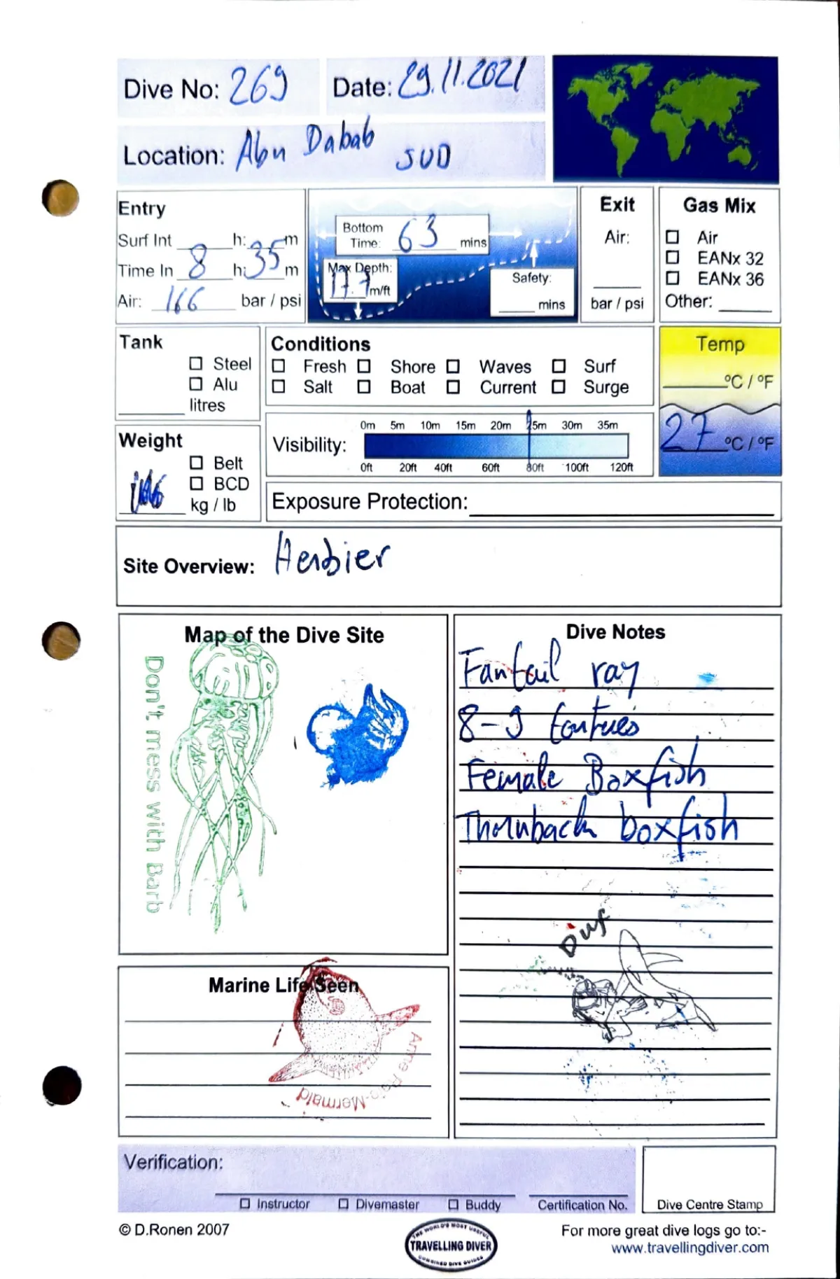 Plongée #269 — Abu Dabab SudMarsa Shagra 29 novembre 2021🕐 08:35 ⏱ 63 min ↓ 17 m 🌡 27°C 🫧 166 bar ⚖ 10 kgAvec HerbierFantail ray. 8-9 tortues. Female boxfish. Thornback boxfishPage du carnet