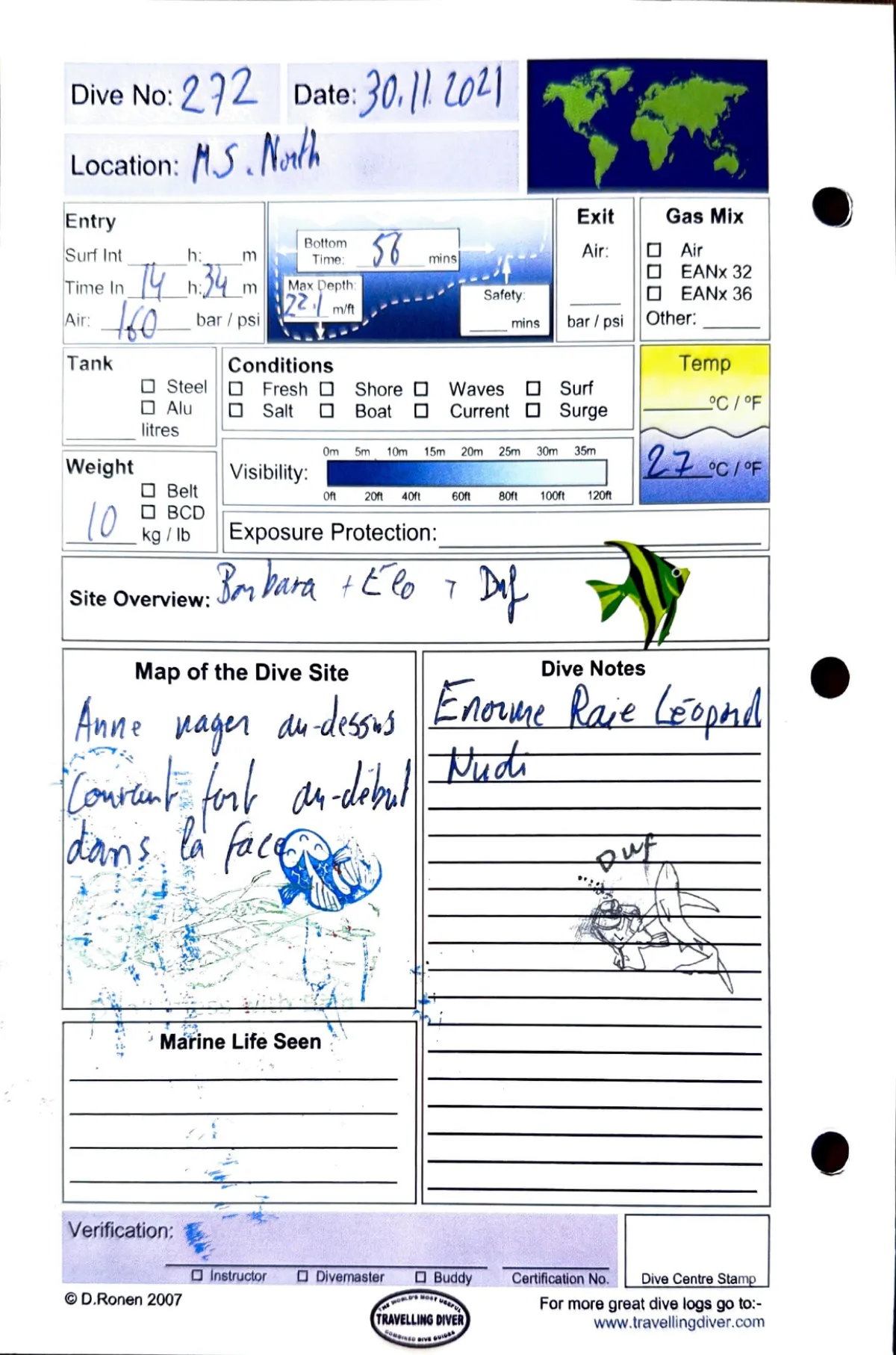 Plongée #272 — Housereef NorthMarsa Shagra 30 novembre 2021🕐 14:34 ⏱ 56 min ↓ 22.1 m 🌡 27°C 🫧 160 bar ⚖ 10 kgAvec Barbara + Elo + DufAnne nager au-dessus. Courant fort au debut dans la face. Enorme raie leopard. NudiPage du carnet