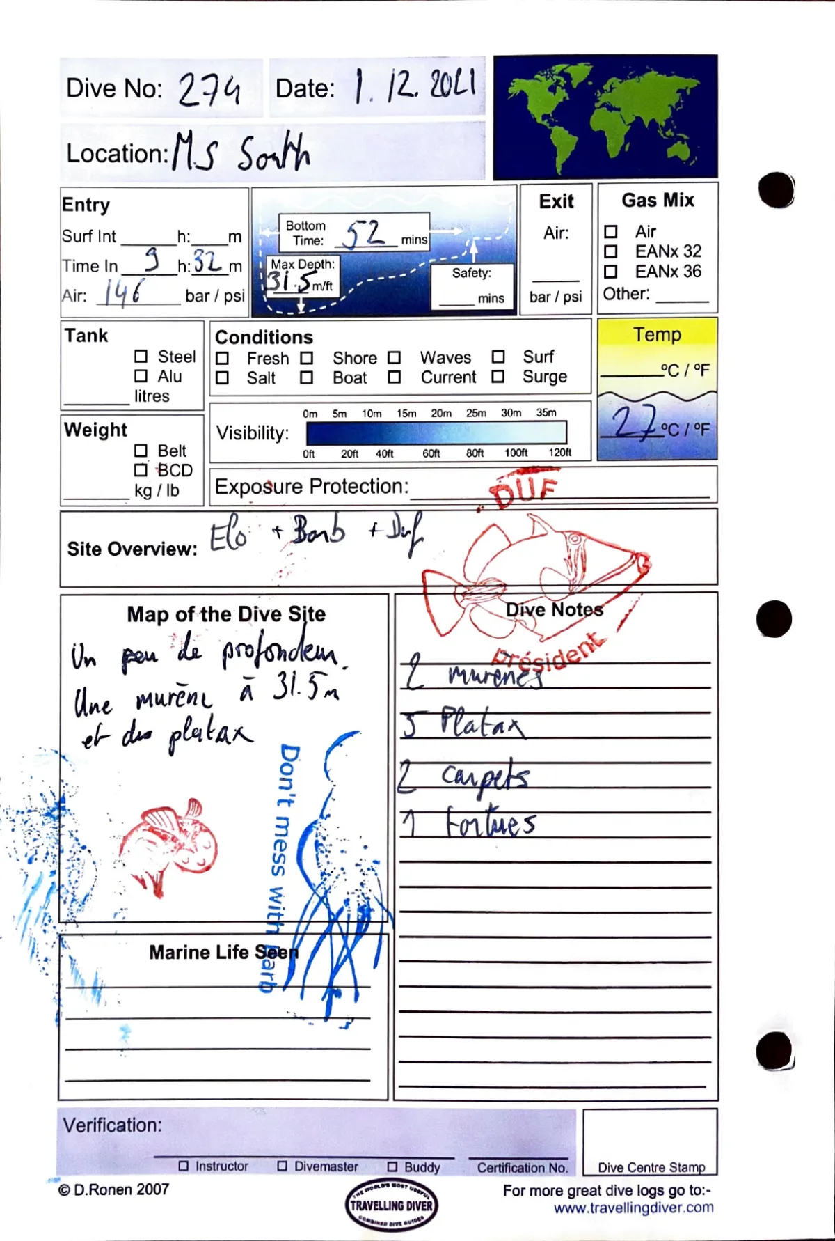 Plongée #274 — Housereef SouthMarsa Shagra 1 décembre 2021🕐 09:32 ⏱ 52 min ↓ 31.5 m 🌡 27°C 🫧 146 bar ⚖ 10 kgAvec Elo + Barb + DufUn peu de profondeur. Une murene a 31.5m et des platax. 2 murenes. 5 platax. 2 carpets. 1 tortuePage du carnet